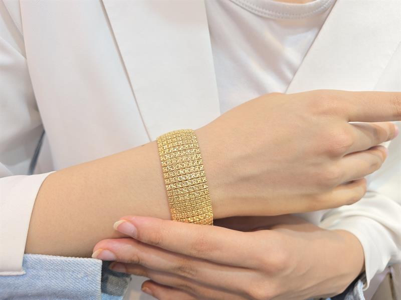 دستبند زنانه تسمه ای توری منعطف با سایز نسبتا بزرگ در گالری طلای اطلس. وزن این محصول 22.87 گرم میباشد و از استقامت مناسبی در دستبند های تسمه ای برخوردار میباشد. محصولات مشابه را در وبسایت طلافروشی اطلس بیابید.