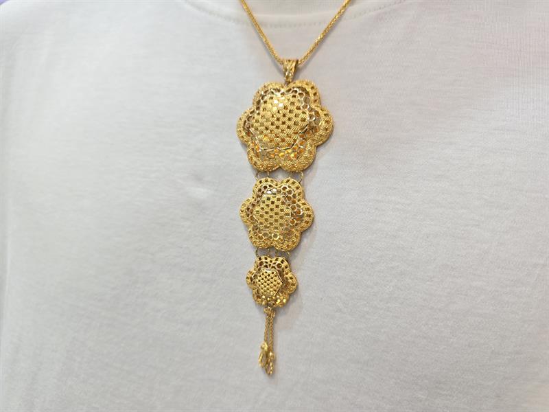 پلاک زنانه بحرینی یا اماراتی نمادار گل با طراحی چند ضلعی مشبک. این نمونه از کارها که با نام کارهای شمش نیز شناخته میشوند معمولا به سنگینی و نمادار بودن شهرت دارند. محصولات مشابه را در وبسایت طلای اطلس در دسته بندی پلاک زنانه بیابید.