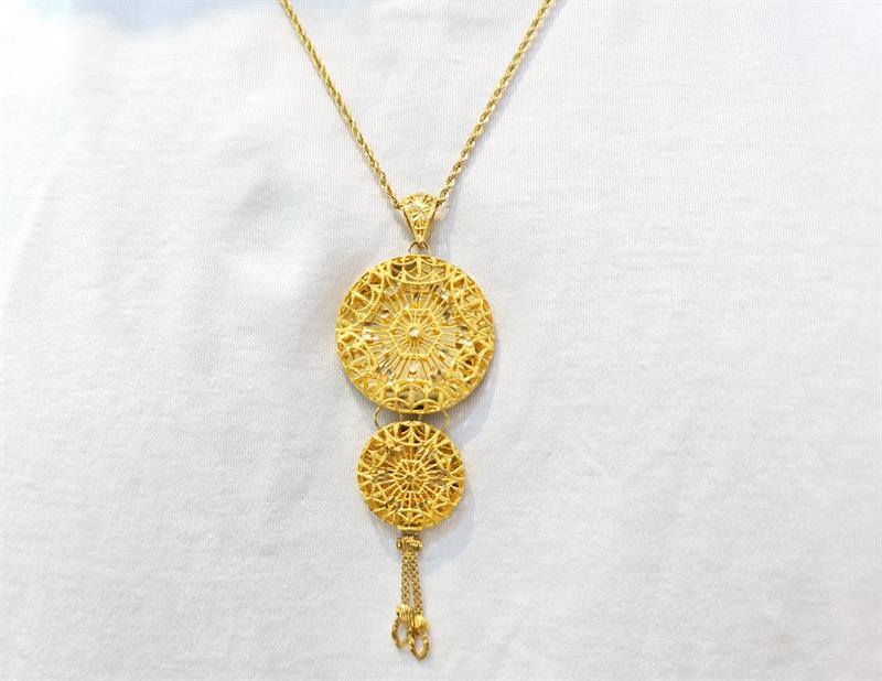 پلاک زنانه بحرینی یا اماراتی نمادار دایره با طراحی چند ضلعی مشبک. این نمونه از کارها که با نام کارهای شمش نیز شناخته میشوند معمولا به سنگینی و نمادار بودن شهرت دارند. محصولات مشابه را در وبسایت طلای اطلس در دسته بندی پلاک زنانه بیابید.